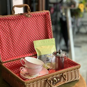 Our retro basket carrier with a set of tea cups and tea pot. Great for an outdoor gathering! Comes with our signature Beauty tea (10 bags)